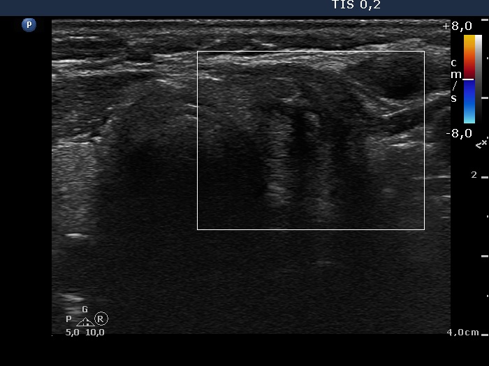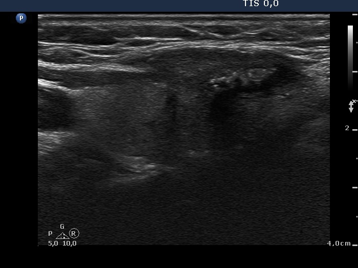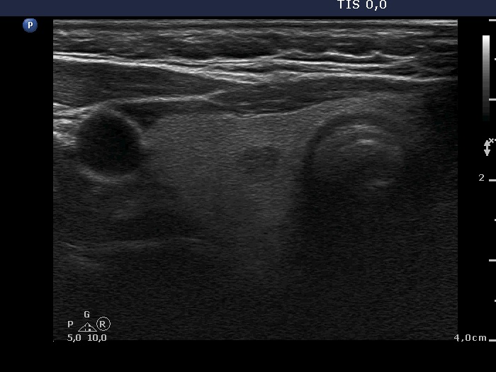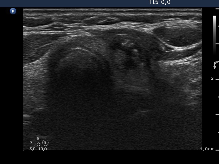Clinical data: A 60-year-old woman underwent a left subtotal resection 10 years ago. Histopathology disclosed follicular adenoma. The patient noticed a hard lump in the left thyroid a few weeks ago. Since then, she felt an unpleasant pressure when turning her head.