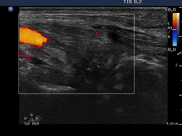Ultrasonography. The cystic lesion has disappeared. The size of the regenerative tissue decreased significantly.