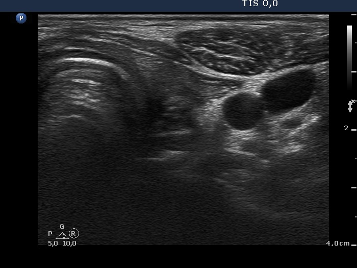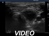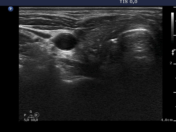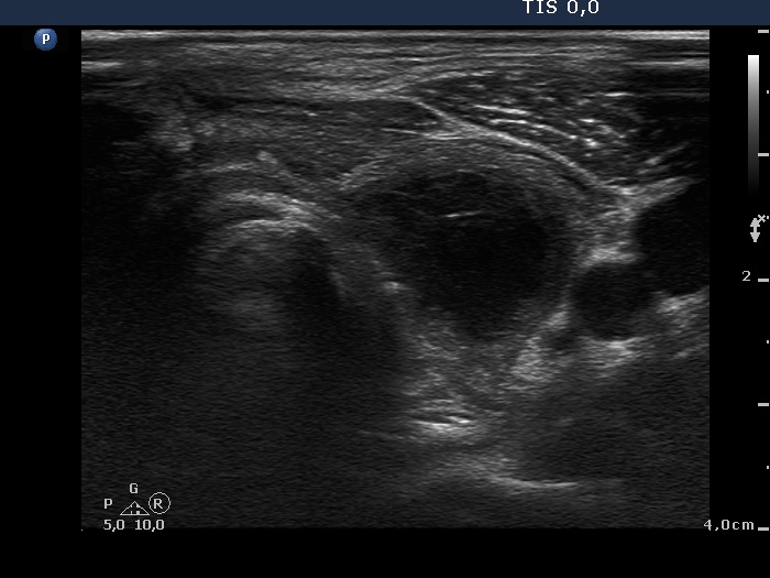 Ultrasonography. The thyroid parenchyma was replaced by regenerative tissue. There was a cystic lesion in the left thyroid bed with a maximal diameter of 23 mm.