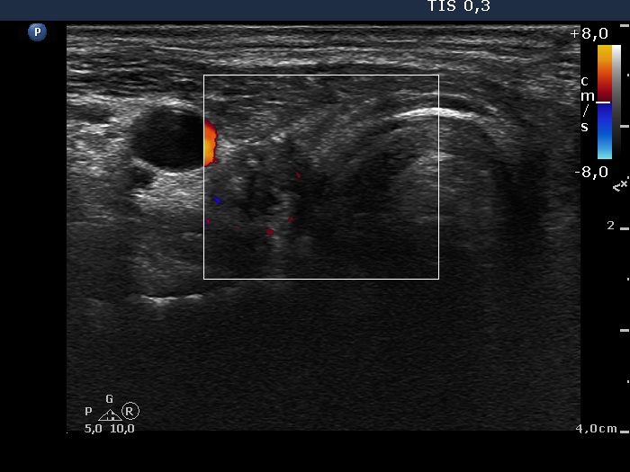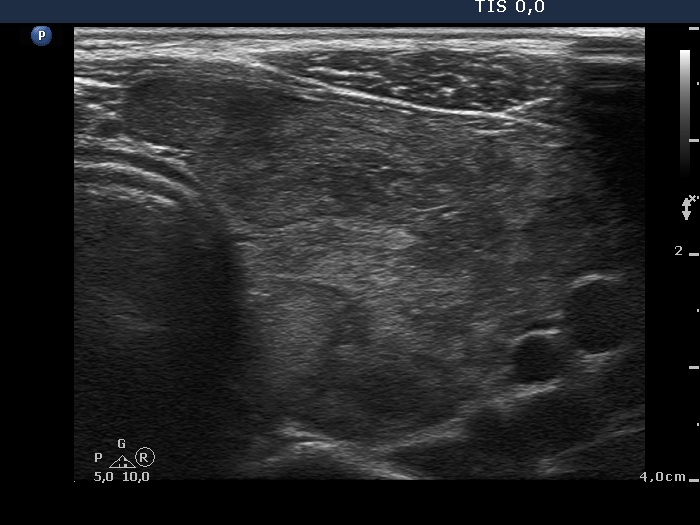 Ultrasonography. The thyroids were echonormal and contained hypoechogenic discrete areas none of them corresponded to a nodule. The echogenicity index was around 30%. The vascularization was average.Surgery was advised. Total thyroidectomy was performed. Histopathology disclosed diffuse goiter, focal lymphocytic thyroiditis.