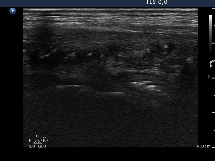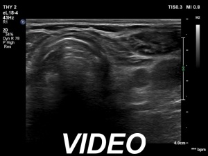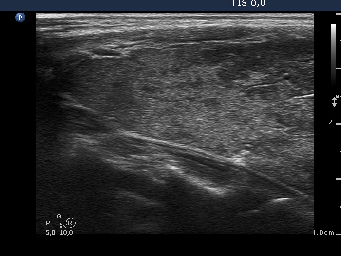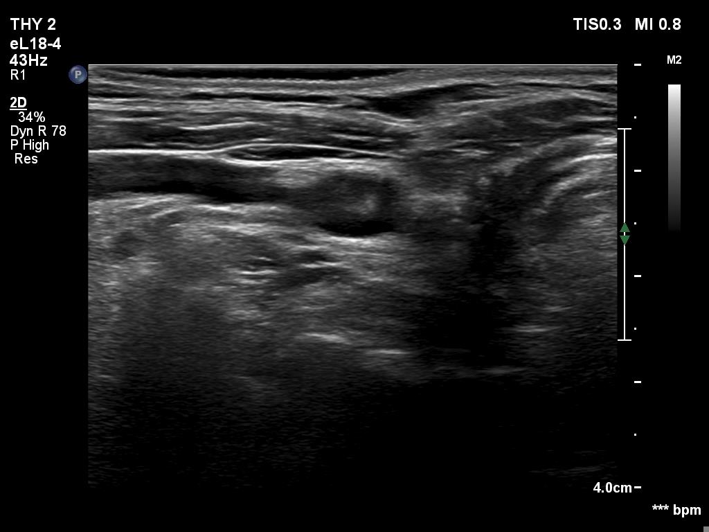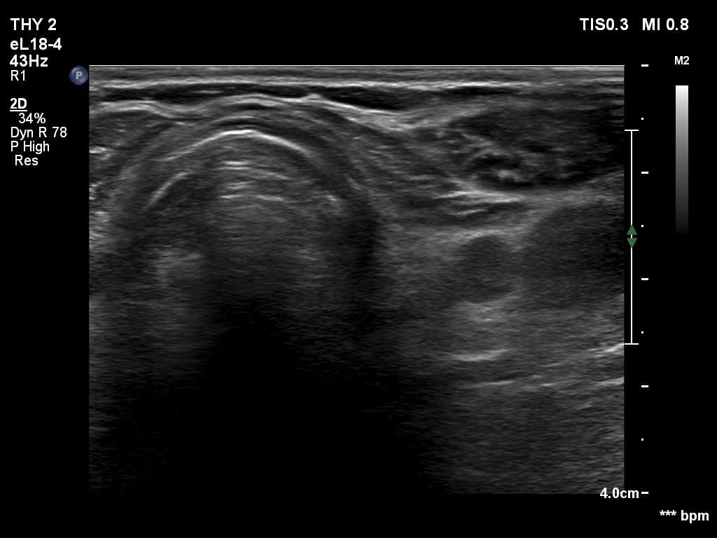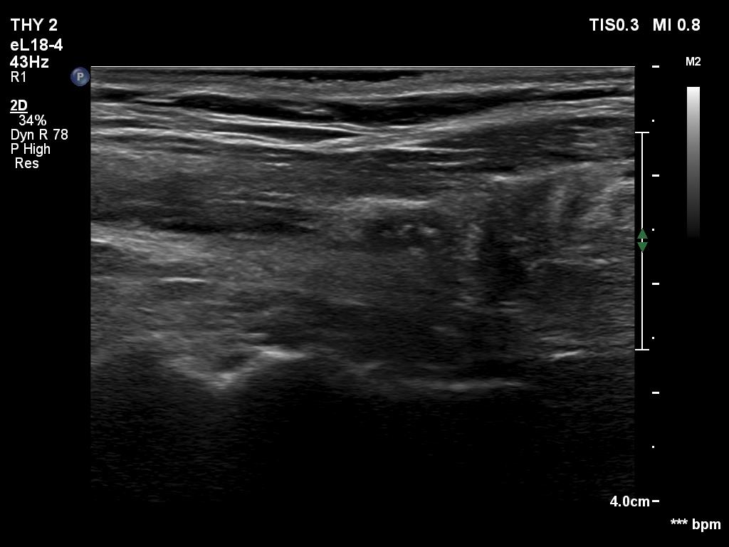 Ultrasonography. There was minimaly if any thyroid remnant in the thyroid beds. Connective tissue replaced the thyroid.