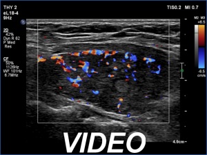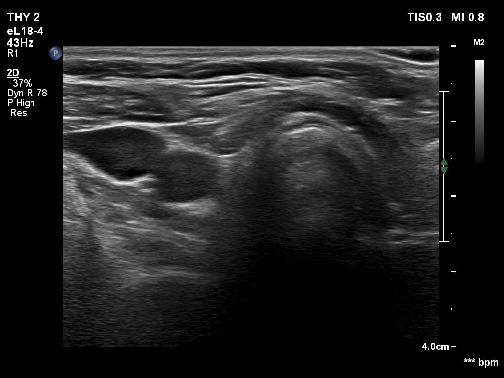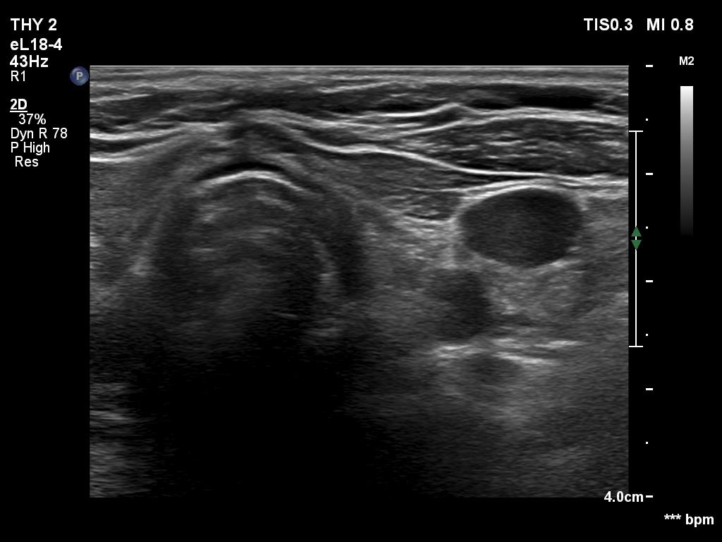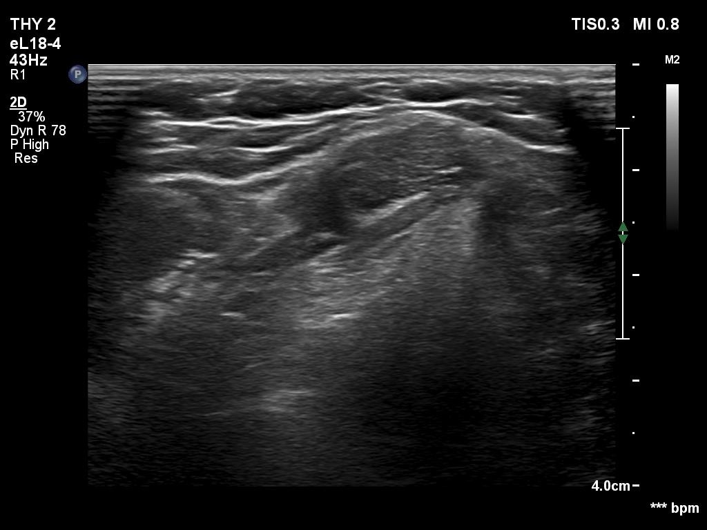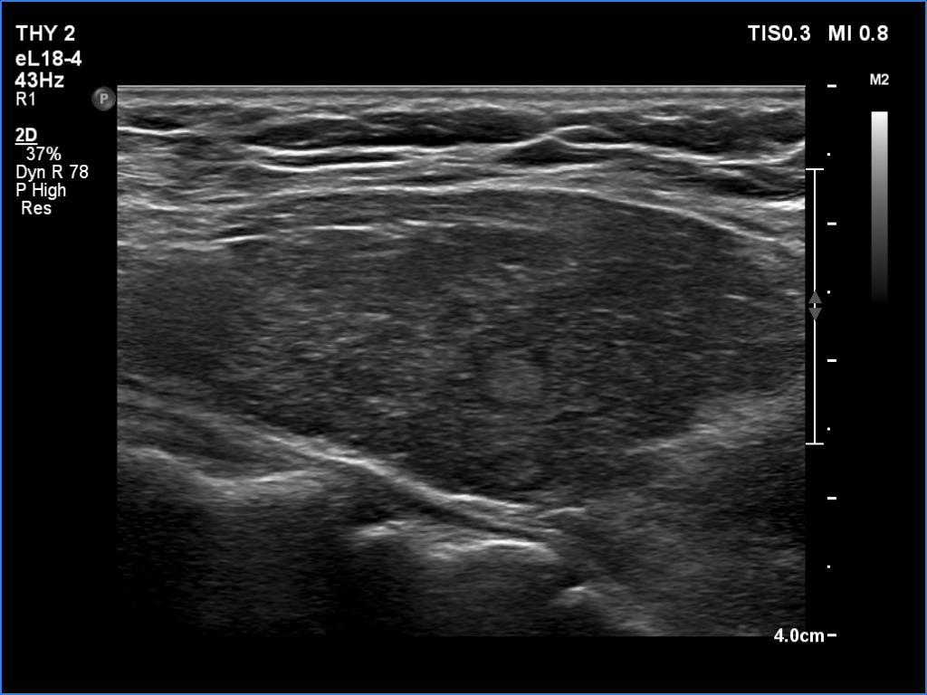 Comment. The palpation remains a crucial examination in thyroid patients. If we did not palpate the neck, this lesion would be very likely overlooked on ultrasonography because of the similarity of the echo structure to the neighboring muscle tissue. The two types of tissue differed in two things, the thyroid gland contained less thick and shiny connective tissue bundles, and circulation was detected in it.Clinical data: On routine follow-up, the surgeon palpated a mass in the middle of the neck. The patient was referred for evaluation and cytology of the mass.
