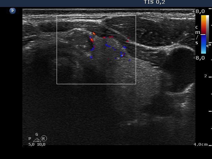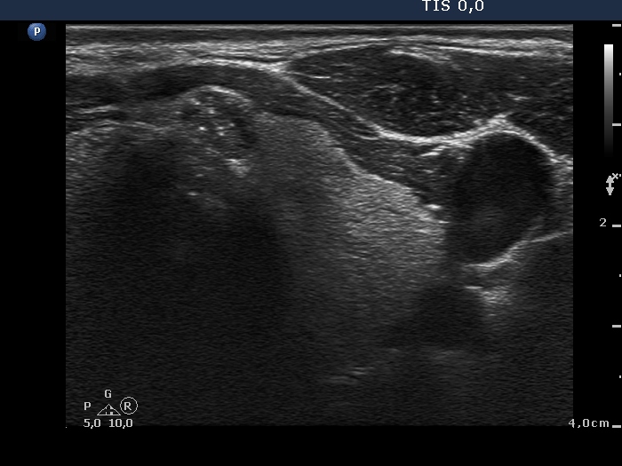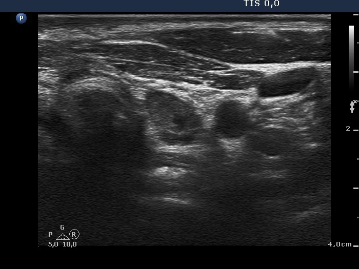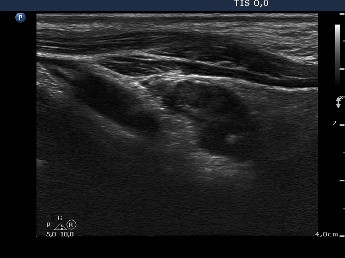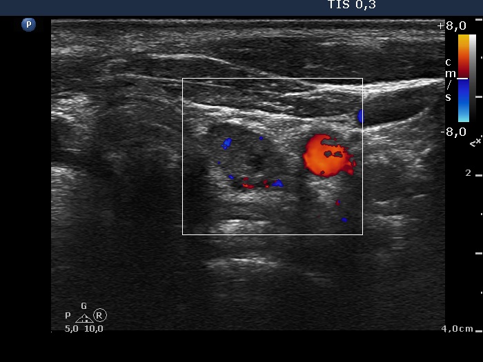 Clinical presentation: The patient underwent on radioiodine therapy. Post-therapeutic thyroglobulin level was 99.1 ng/mL while 3 months later the TG level fell only to 36.5 ng/mL. An ultrasound examination was initiated.