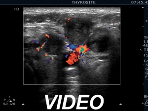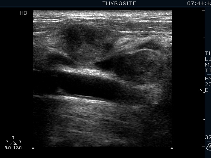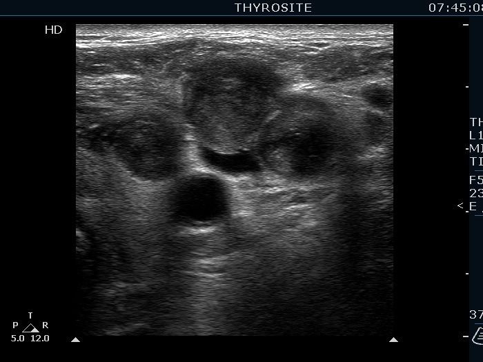 Ultrasonography. The right lobe was echonormal and presented several hypoechoic nodules. A large, inhomogeneous, partly deeply hypoechoic, partly minimally hypoechoic or echonormal mass occupied the left lobe. The borders of the tumor were irregular. There were multiple lymph nodules upper and lateral to the left thyroid lobe. The nodes had a heterogeneous pattern and lacked hilum. The vascularity was scanty both in the thyroid nodules and the lymph nodes.