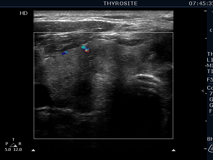 We met the patient 8 years ago. The thyroid was echonormal. The right lobe had a solitary hypoechoic nodule with the dimensions of 12x10x13 mm, width, depth, length, respectively. FAN resulted in benign, colloid goiter.