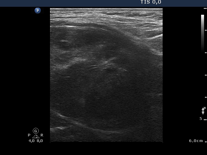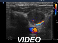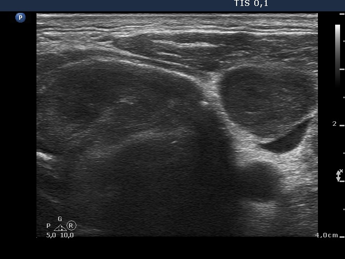 Ultrasonography revealed that the palpable mass contained the enlarged left thyroid composed of a large hypoechogenic nodule with irregular borders and multiple irregular lymph nodes in the left side of the neck.