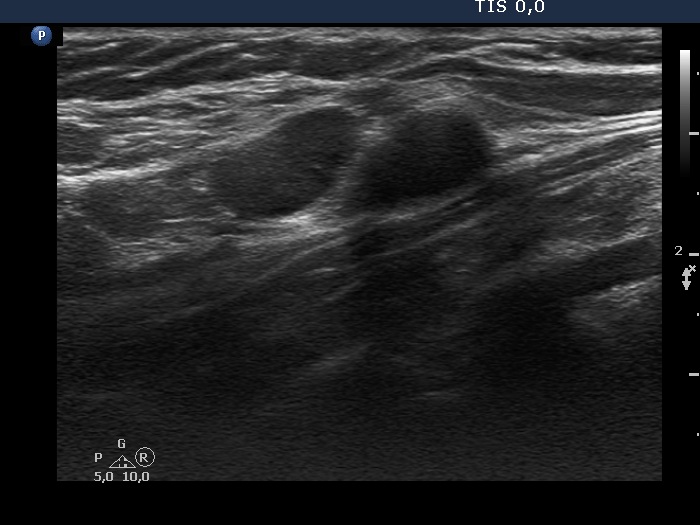 Palpation: Both thyroid lobes were a bit firm, but no discrete lesions could be palpated. Numerous firm lymph nodes were palpable at both sides of the neck.