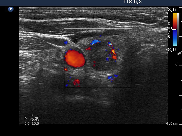 Histopathology disclosed three different entities corresponding to the three nodules found on ultrasound: the right lesion proved to be a hyperplastic nodule, the upper left nodule a classic variant of papillary carcinoma while the lower left lesion did a microfollicular adenoma. Another focus of papillary carcinoma was found in the right lobe with a maximal diameter of 1.5 mm, which was a dominantly follicular variant of papillary carcinoma.