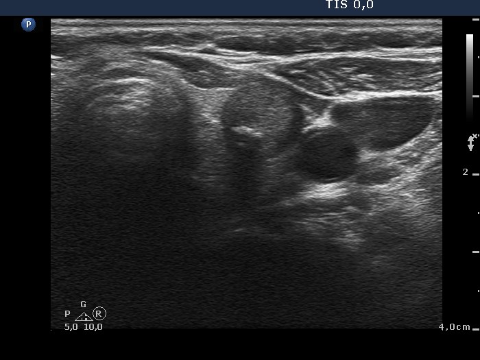 Ultrasonography. The thyroid was echonormal. Beside small hypoechogenic discrete areas there was one hypoechogenic nodule in the right, while two moderately hypoechogenic lesions in the left lobe. The nodule in the upper third of the left lobe was suspicious on ultrasound because of the presence of microcalcifications.