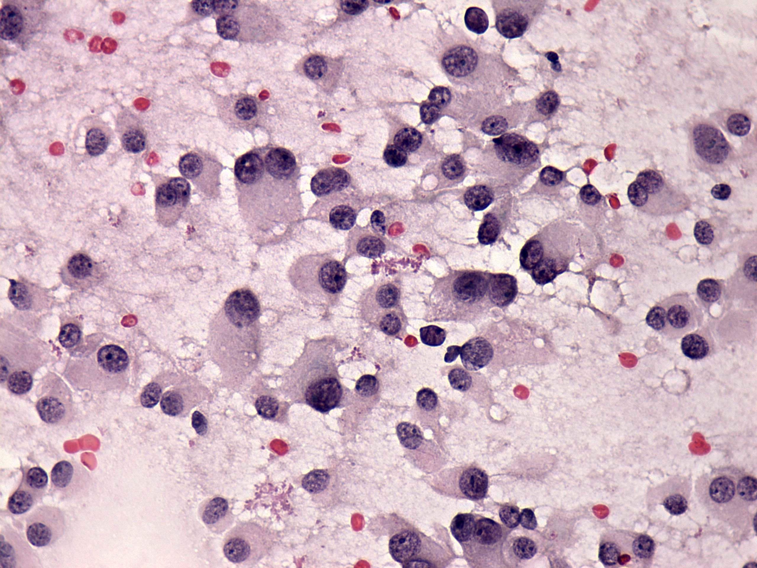 Pap-smear, 400x. The nuclei have either a coarsely granular chromatin structure or contain prominent nucleoli.