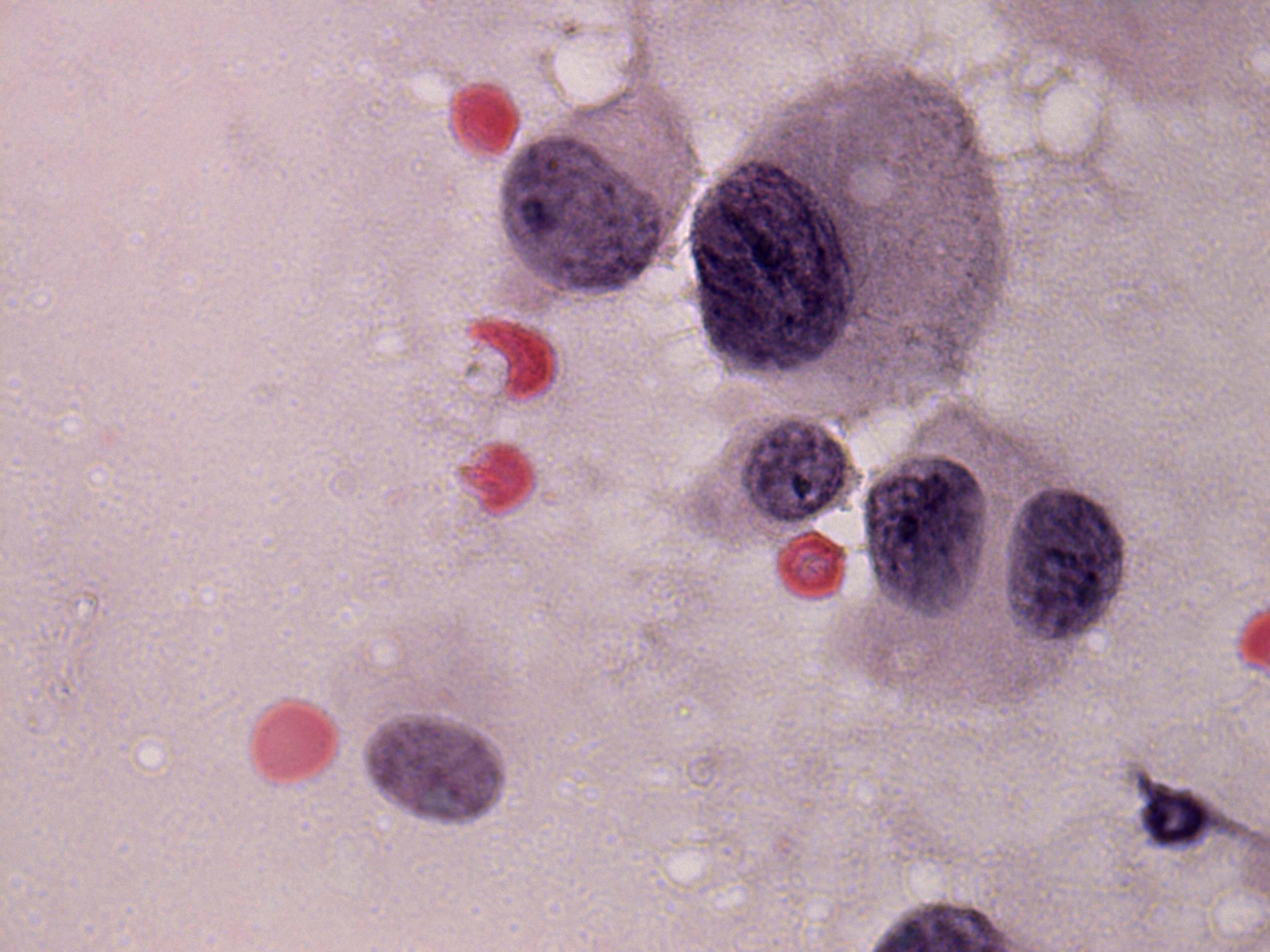 Pap-smear, 1000x. There are aypical pleomorphic cells.