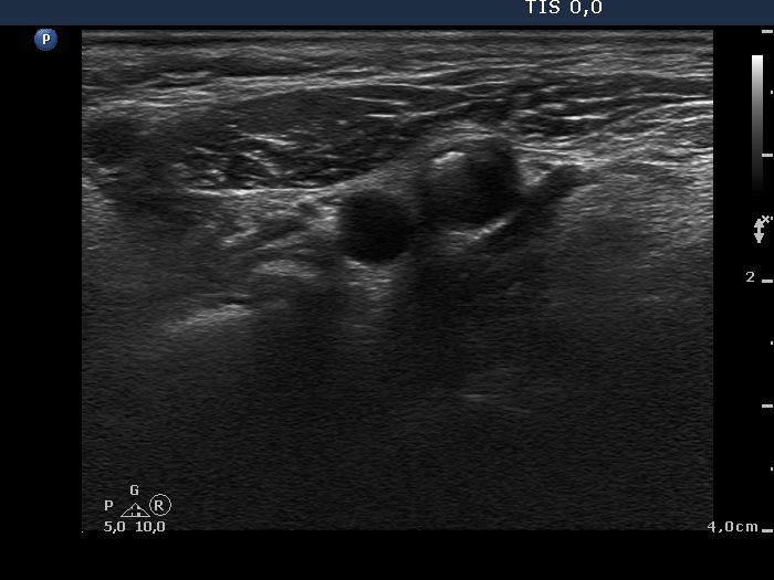 Lateral to the left lobe, transverse view. There is a node presenting microcalcifications.