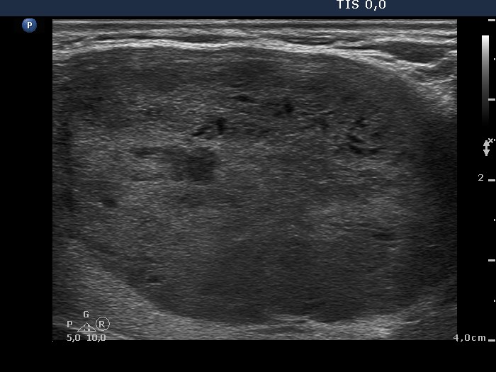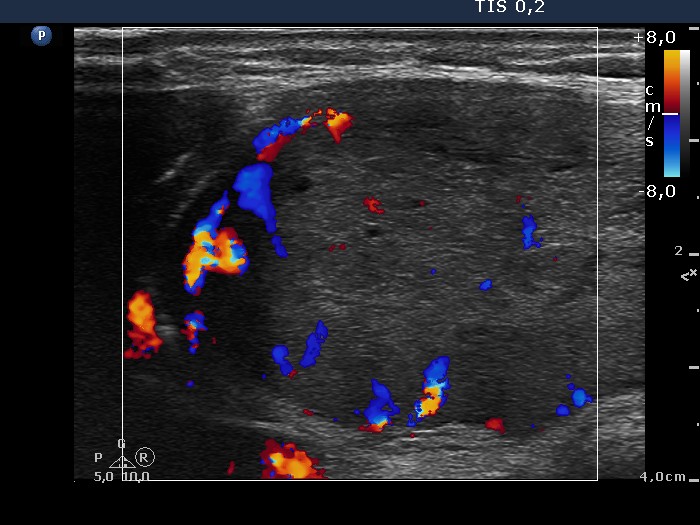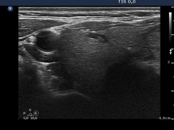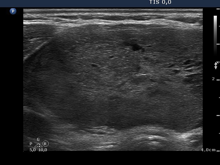 Ultrasonography. The thyroid was echonormal and presented several discrete hypoechogenic lesions. There was a large moderately hypoechogenic nodule in the isthmus. The nodule did not display halo but did perinodular blood flow.