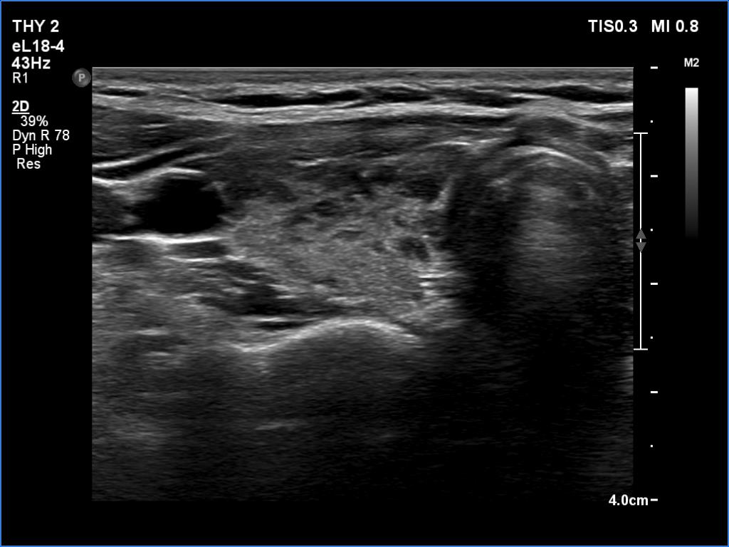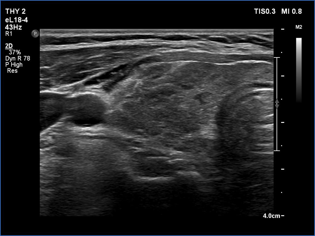 This is quite a unique subgroup which are used in the European and Korean TIRADS while the American systems do not have a similar category. The definition is laconic: 'No nodule'. The question is obvious: nodules in what sense? I guess that a fully intact thyroid without any discrete lesions would not be worth a separate group. Therefore, it is likely that the authors here did not think of the nodule in a radiological but in a pathological sense. If so, then the issue is to distinguish between discrete lesion of that are pathologically nodules and those that are not. This is the most challenging part of the thyroid ultrasound because it manly involves the focal form of thyroiditis.