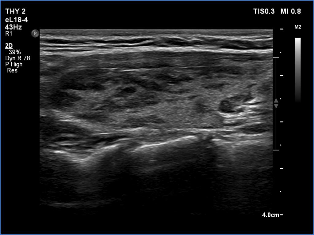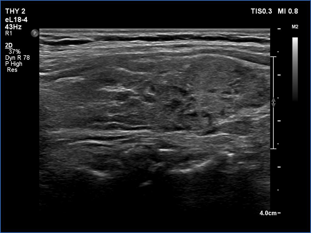 Focal form of lymphocytic thyroiditis is presented. The thyroid has numerous discrete, hypoechoic lesions which correspond to more active foci of thyroiditis. The interpretation of this pattern should not cause concern - these areas are not pathological nodules.
