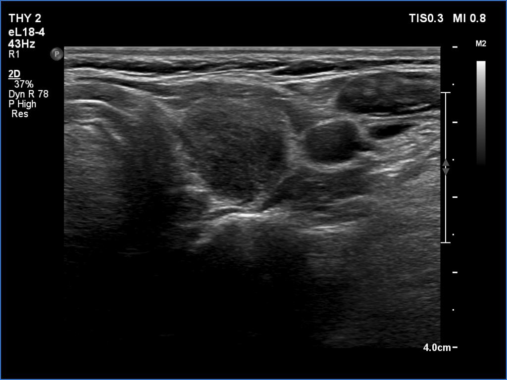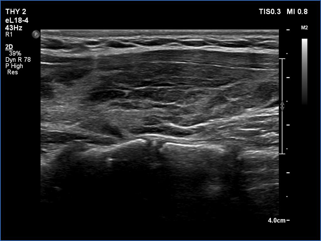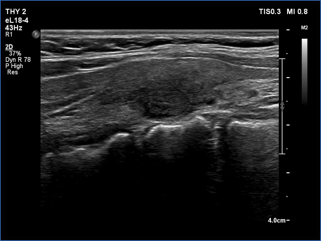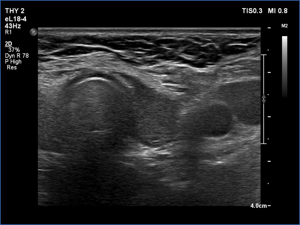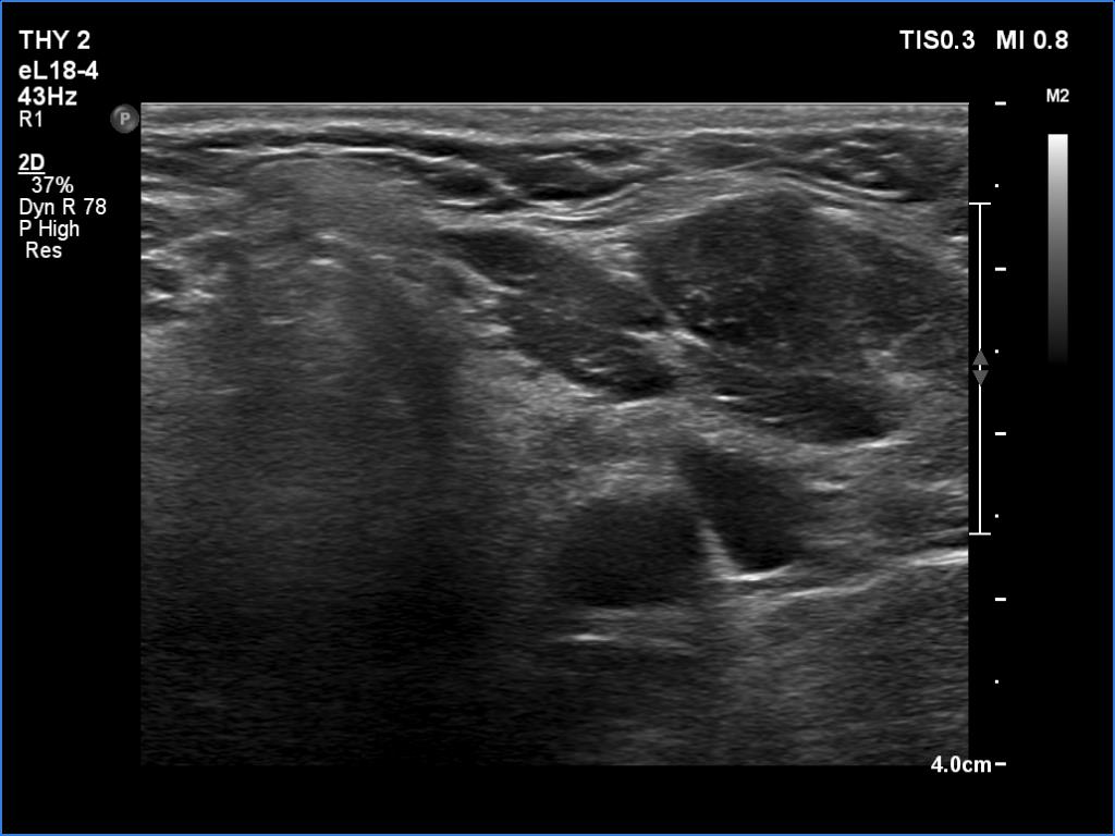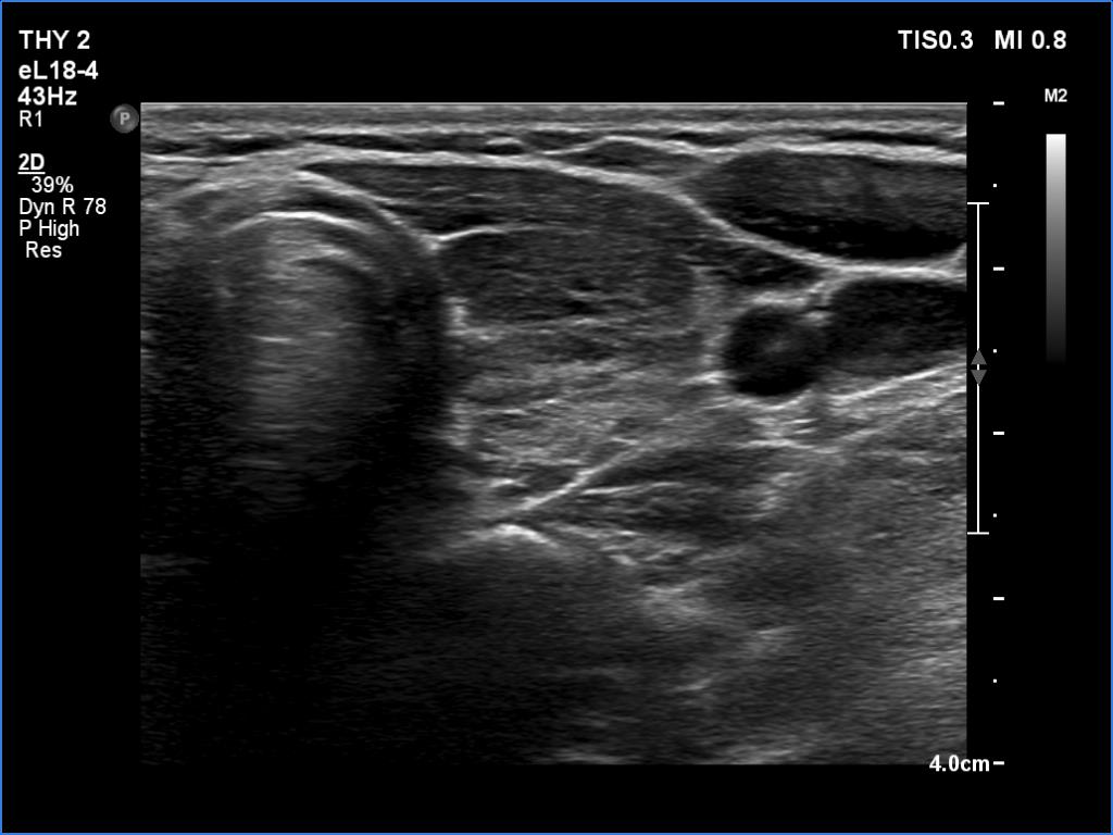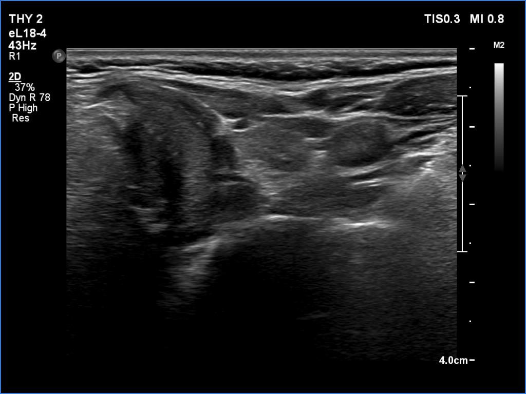The echonormal areas which surround the hypoechoic lesion can be tracked up, down and sideways, therefore these do not correspond to thyroid tissue but to connective tissue.