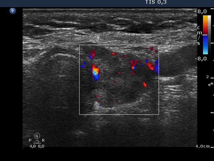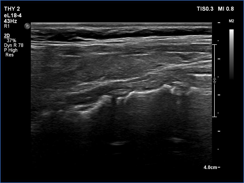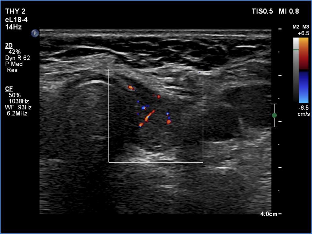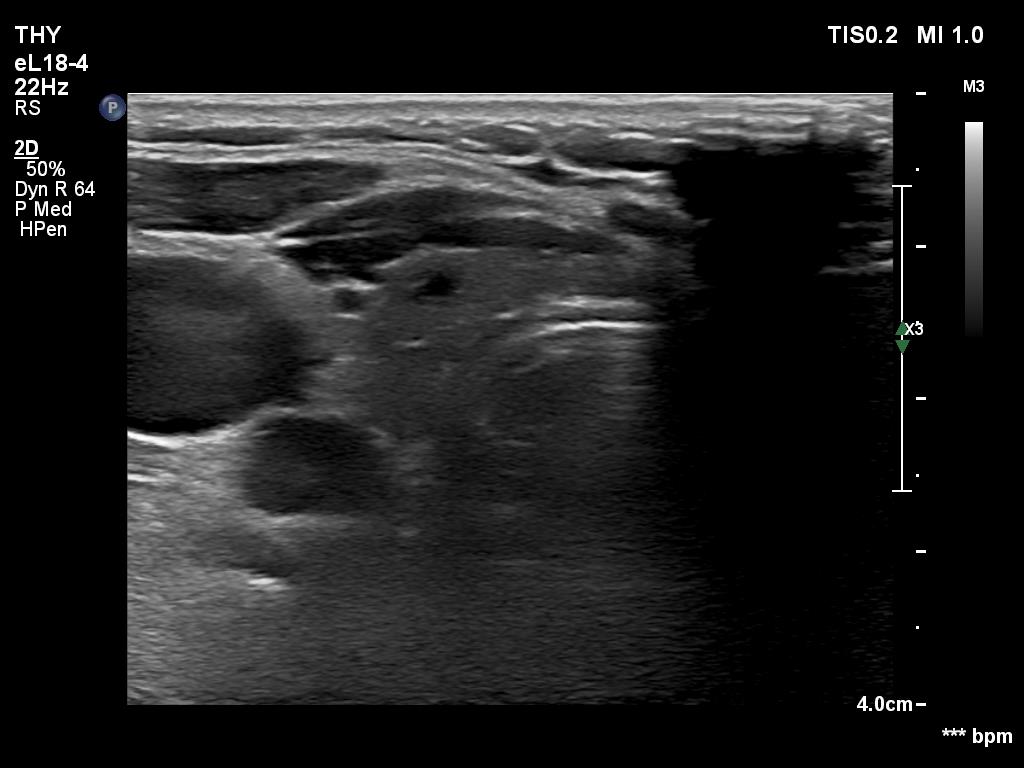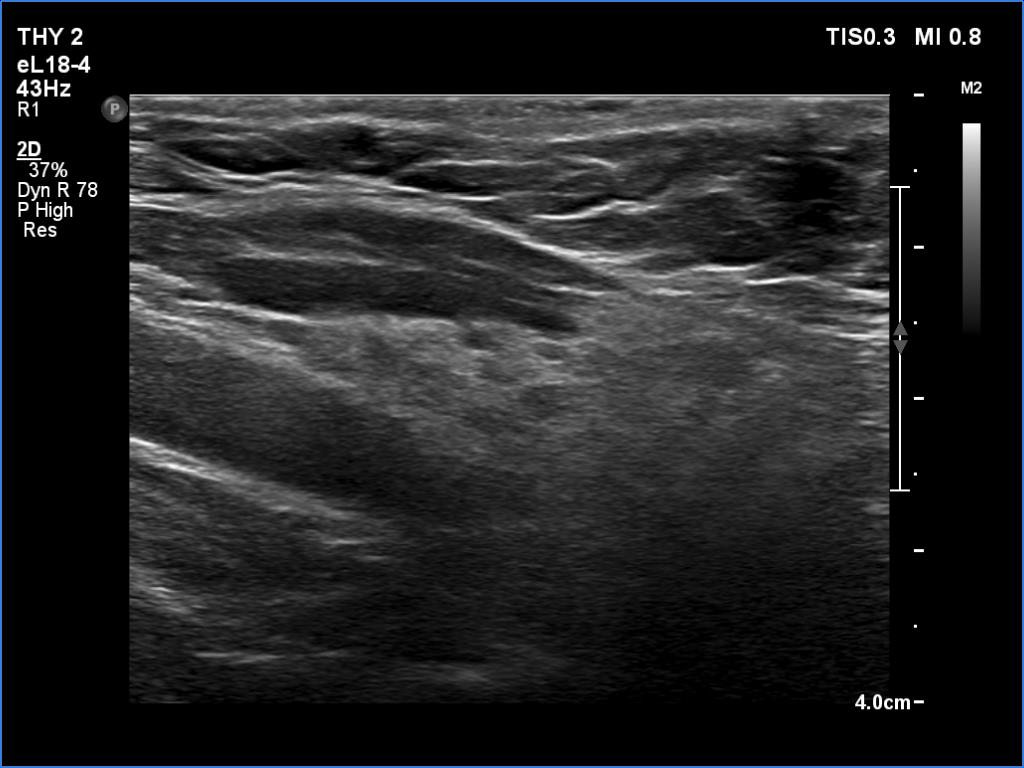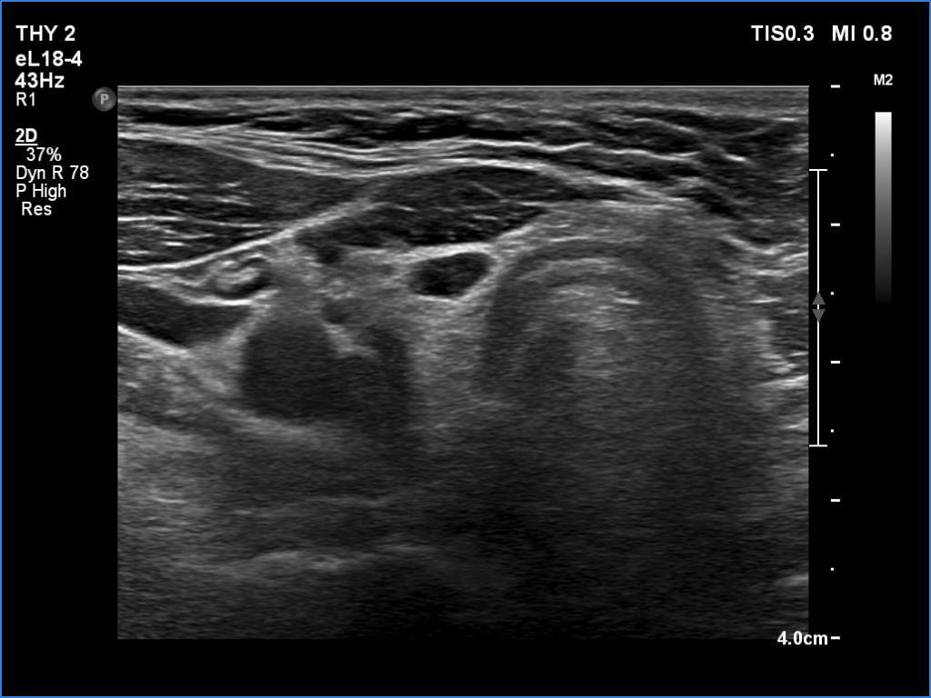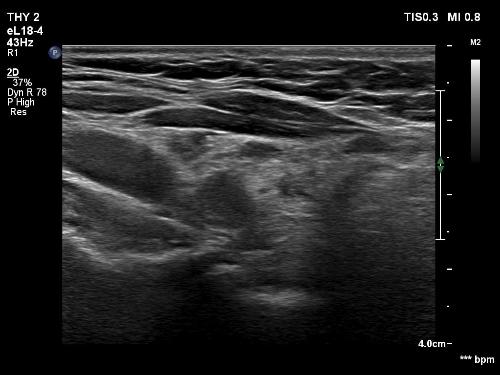 The echonormal areas which surround the hypoechoic lesion can be tracked up, down and sideways, therefore these do not correspond to thyroid tissue but to connective tissue.
