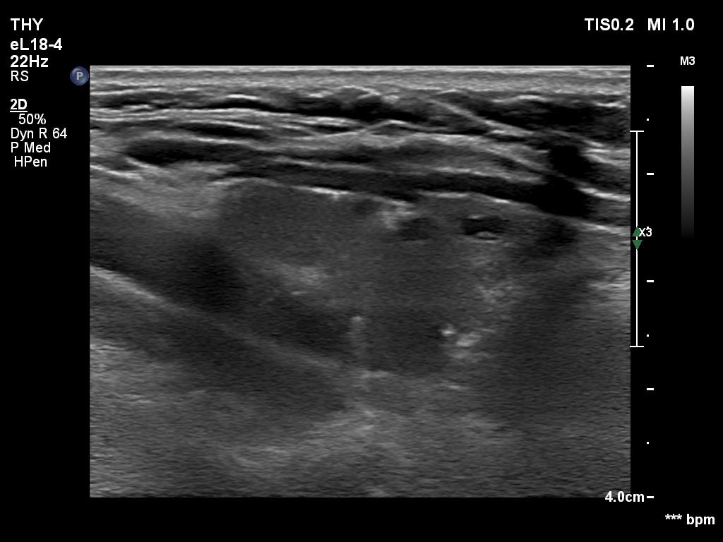 Focal form of lymphocytic thyroiditis is presented. The thyroid has numerous discrete, hypoechoic lesions which correspond to more active foci of thyroiditis. The interpretation of this pattern should not cause concern - these areas are not pathological nodules. The discrete lesions have non-regular, partly clearly lobulated or spiculated margins.
