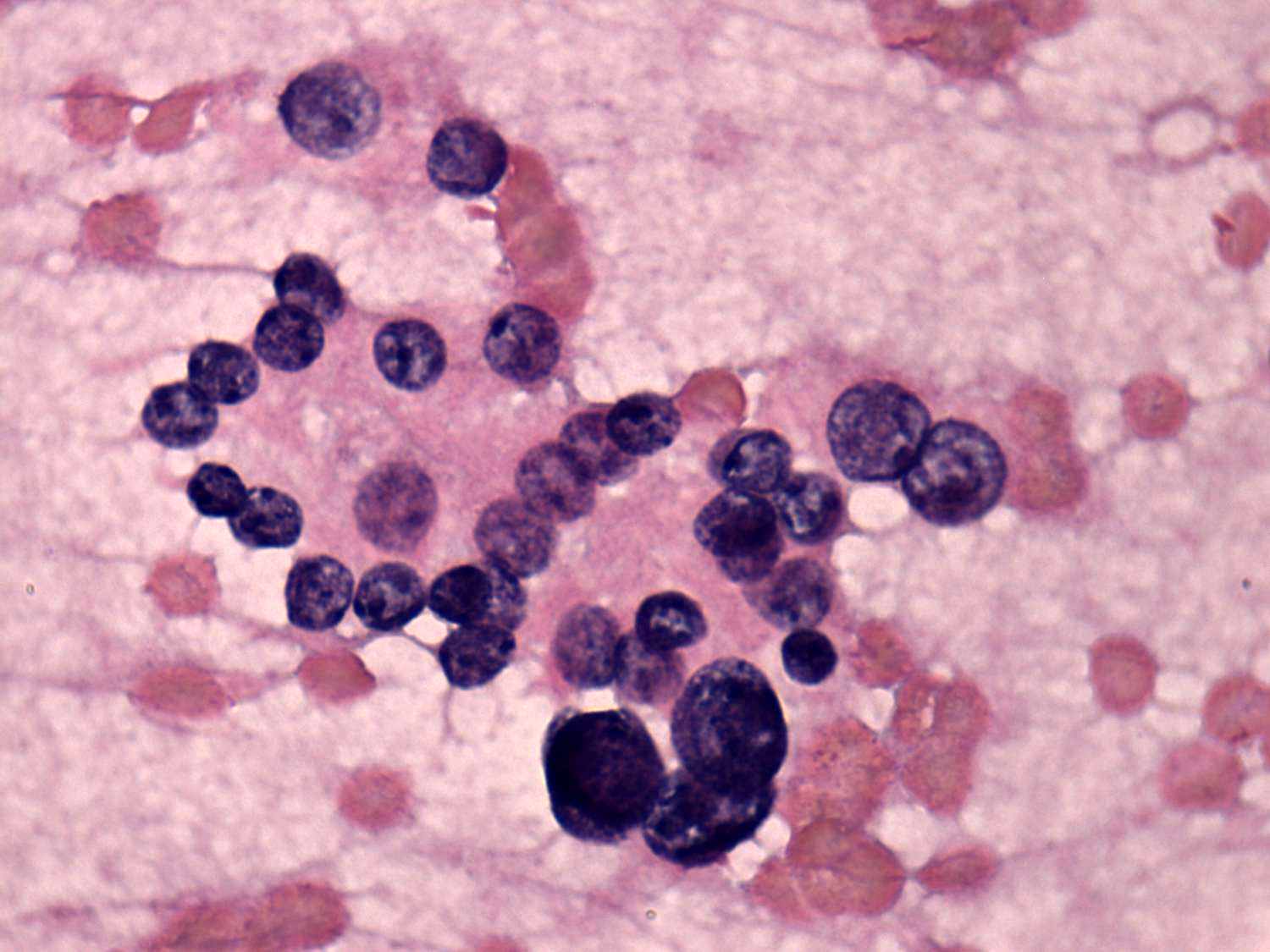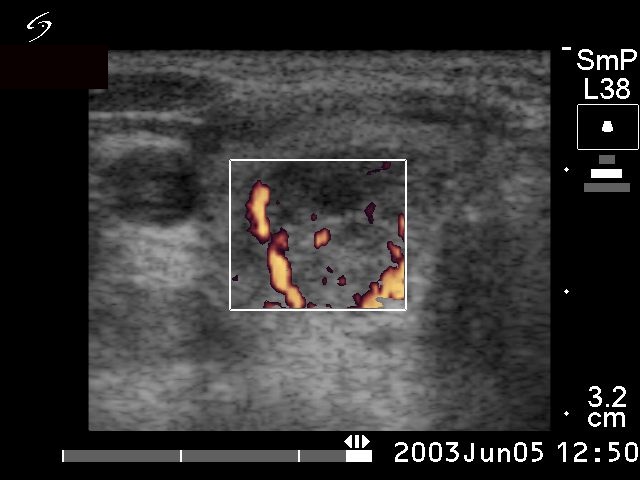 Both cases present a microfollicular proliferation. There were several atypical cells in the right case which increased the likelihood of malignant variant of follicular carcinoma. The ultrasound presentation of the left case is equivocal. A solitary, not regularly geometrical nodule is presented which did not display halo sign. Although there were signs of a perinodular blood flow, most vessels demonstrated in the image run not within the rim of the lesion but run from the border into the lesion. |